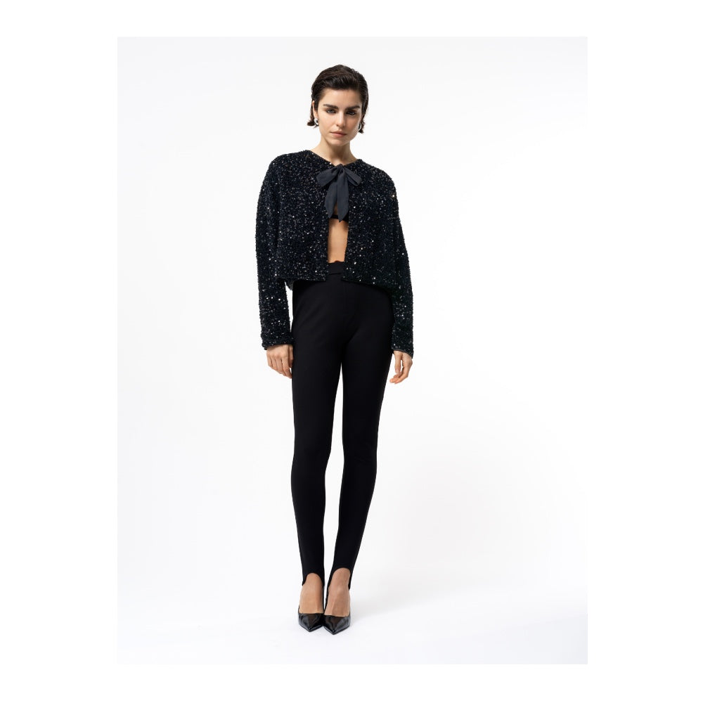 Monet Sequin Bow Tie Cardigan ger vintageglamour en skimrande uppdatering. Denna beskurna cardigan har paljetter över hela kroppen tillsammans med en iögonfallande knytbar rosett i halsen.
