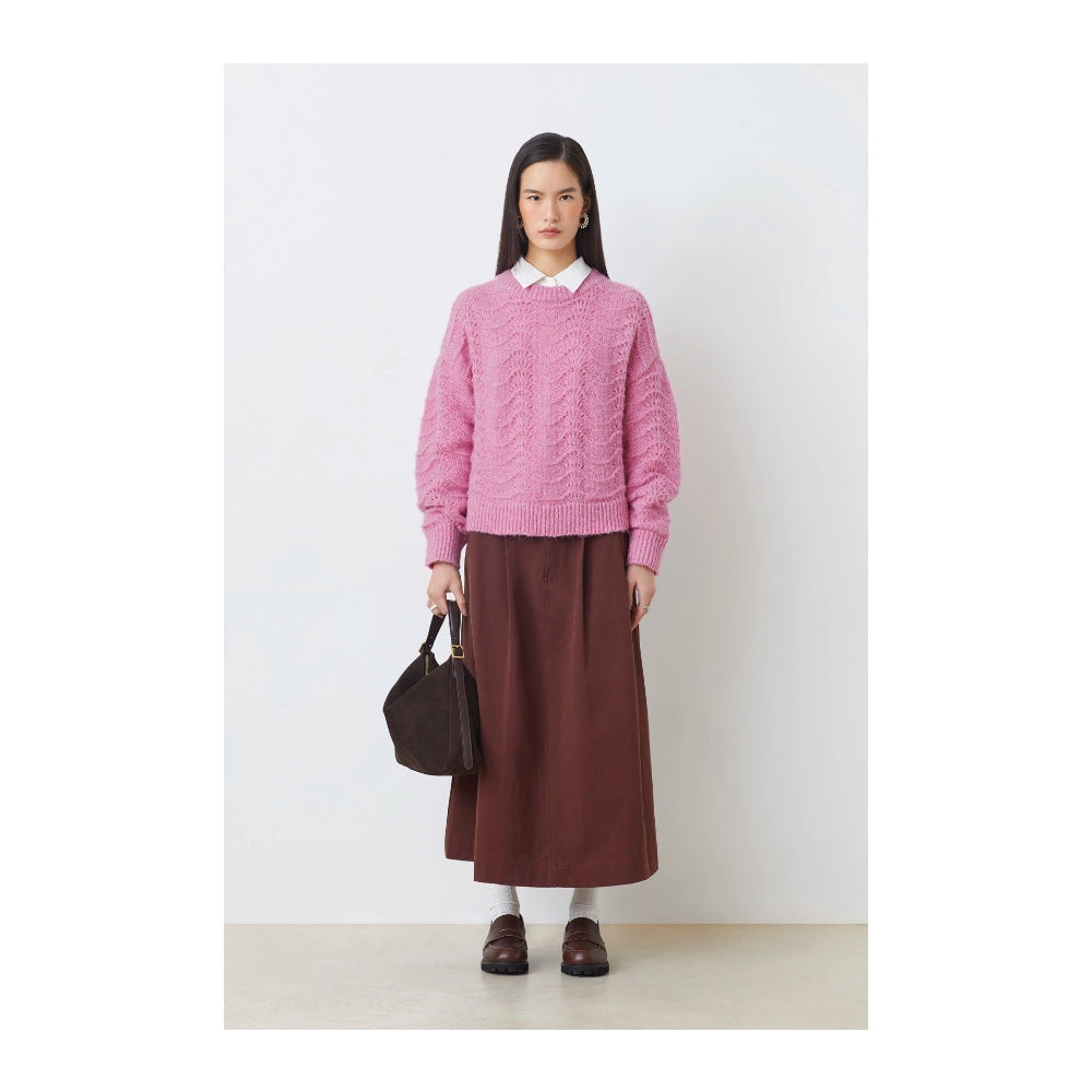 Rosa stickad tröja med vågeffekt.